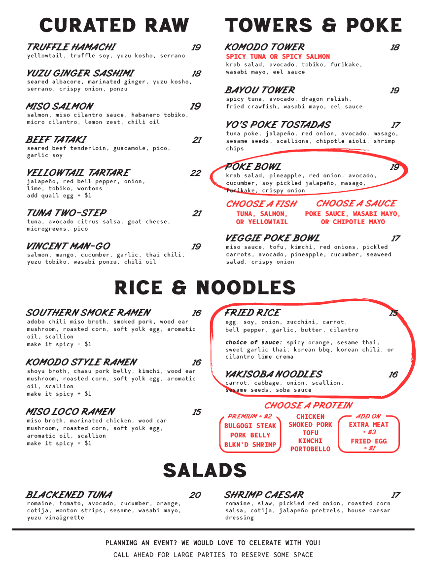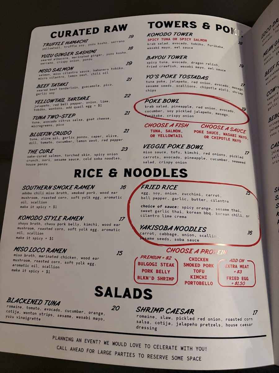 tuna, salmon, or yellowtail, choice of poke, spicy mayo, or wasabi mayo, krab salad, pineapple, red onion, cucumeber, soy jalapenos, masago, furkikake, crispy onion
