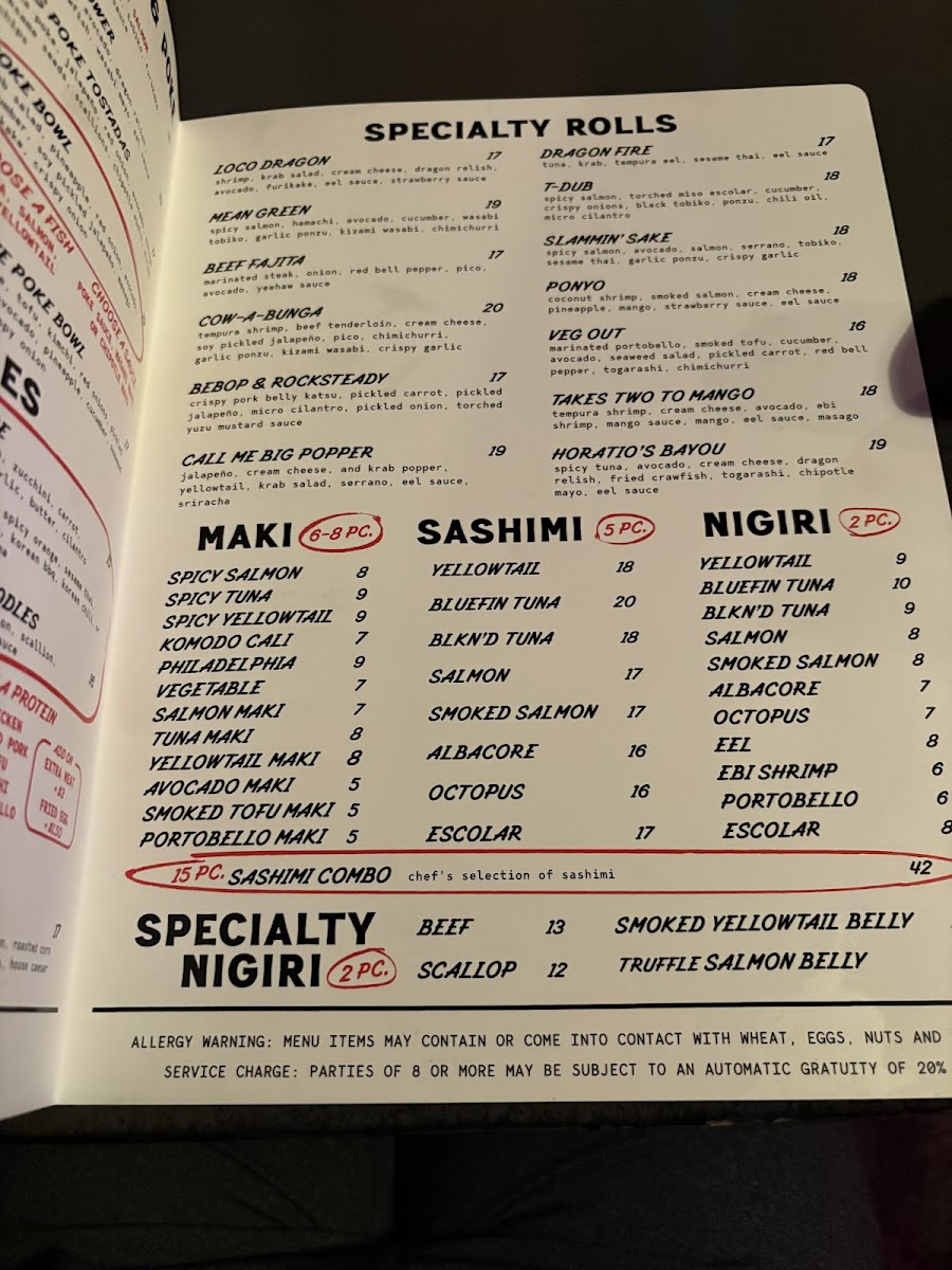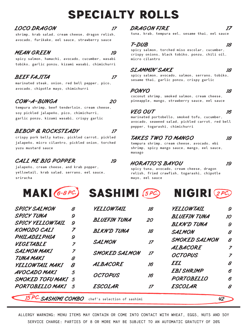 spicy tuna, avocado, cream cheese, dragon relish, crawish, togarashi, chipolte mayo, eel sauce